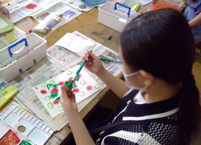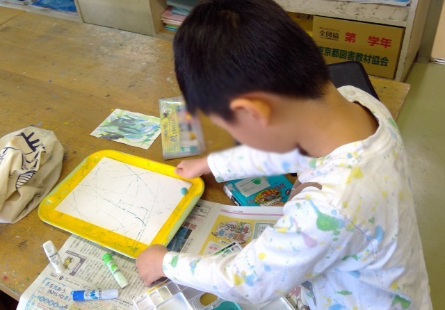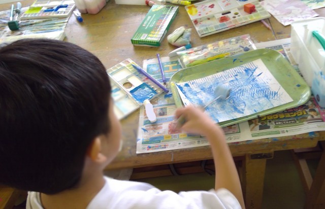 水で濡らした画用紙に絵の具を垂らす以外にも、ビー玉・段ボール・スポンジなどの素材を使いました。
