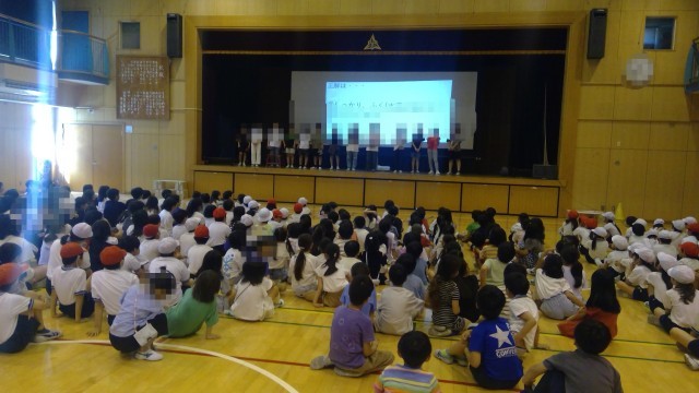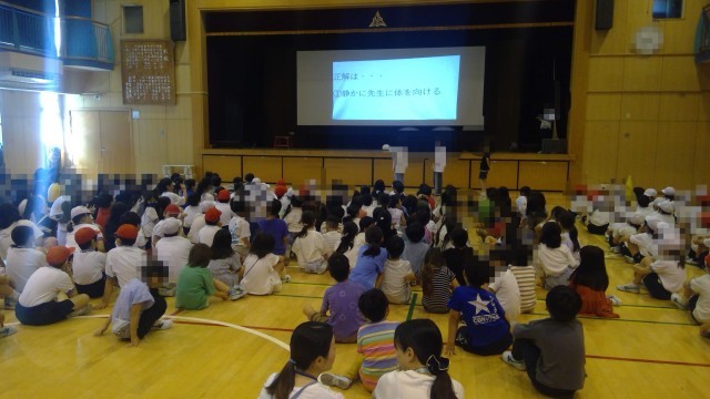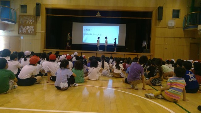 今回は、来週から始まる水泳の学習の際の、ルールについて、運動委員会がデモンストレーションとクイズを交えながら行いました。