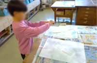 5年生の作品の完成です。色の重なりやマスキングテープでできる形を考えて作ることが...