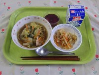 五目ご飯たくあんのおかか和え塩ちゃんこ汁牛乳