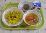 パエリア 白菜とトマトのスープ ココアドーナツ 牛乳