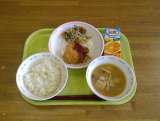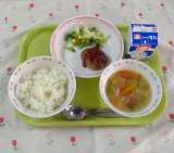 ご飯 おみくじハンバーグ フレンチサラダ ジュリエンヌスープ 牛乳