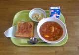 アップルトースト マカロニ入りキャベツサラダ いかのトマトシチュー 牛乳