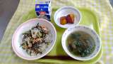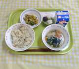 鯛めし 菜の花ソテー 豆腐と湯葉のすまし汁 抹茶プリン 牛乳