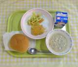 バンズパン パリパリチキン キャベツのカレー和え クラムチャウダー 牛乳