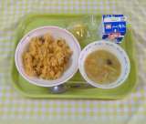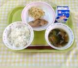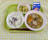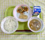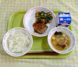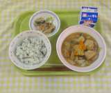 わかめご飯 厚揚げと鶏肉の味噌煮 お浸し 牛乳
