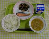 ご飯 焼き鮭 ひじきと大豆の炒め煮 具だくさん味噌汁 牛乳