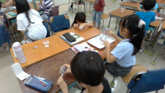 算数「かさ」の学習では、自分の1dLますを作成しました。1dLますの10杯分が1L。自分が作ったdLますで確認しました。おうちでもいろいろなかさを測ってほしいです。