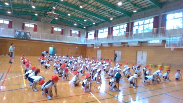全体運動会練習2日目は、新しい動きを取り入れて、全体で揃える練習をしました。各クラスのダンスリーダーから始まる動きは、1列になってダイナミックに魅せてくれる演技のようです。色つきのゼッケンには、演技のヒントがあることを学び、早速試してみました。先生の動きをよくみて、お友達ともお互いに見合いながら精一杯練習しています。