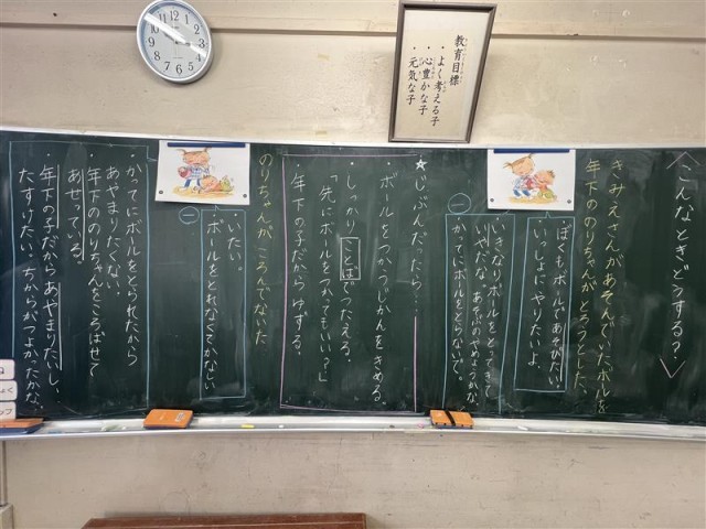 子どもたちからは、「年下の子だからボールを譲ってあげる。」「話さないと自分の気持ちは伝わらないから、優しく声をかける。」など、たくさんの意見が出ました。