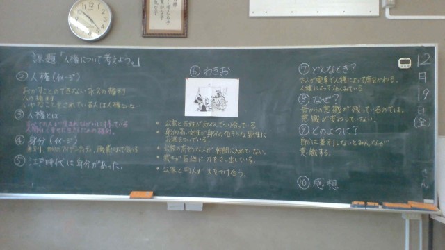 6年生は社会科で歴史を学習しています。12月に明治時代に入り、教科書に身分の平等をあらわす風刺画が載っていました。その風刺画を使ってみんなで、人権とは何かイメージを共有したり、意味を確認したり、江戸時代の身分社会についてもう一度考えたりしました。明治時代の風刺画をよく見ると、いろいろな身分の人が平等に接していることがわかりました。現代の私たちが江戸時代のような身分を感じることはなくなりましたが、みんなからはまだこの世界には差別などがあるのではないか、と問題提起があり、なぜなのか、どうすればよいのか、など考えを深めることができました。