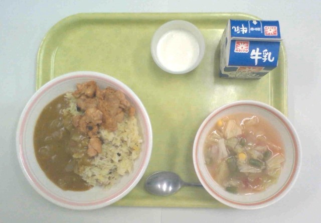 今日は保険・給食委員会のみなさんが考えた献立です。ビリヤニにはインディカ米のバスマティライスを混ぜて、本格的なビリヤニに仕上げました。調理員さんがいろんな所でビリヤニを食べて、子供たちが食べやすい味にアレンジして作ってくださいました。
