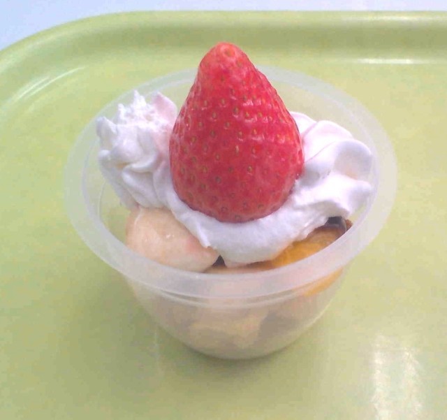 今日はリクエスト給食のパフェです。コーンフレーク、バナナ、みかん、チョコソース、豆乳クリーム、いちごの豪華なパフェでした。子供たちが喜んで食べている様子を見て嬉しかったです。