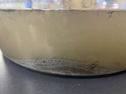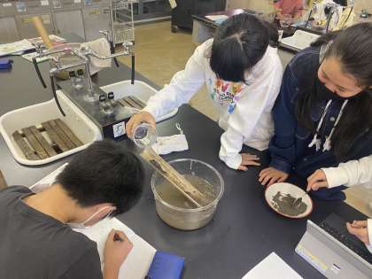 土を水の中に流し込む実験で、流れる水のはたらきによってどのように地層ができるか調べました。