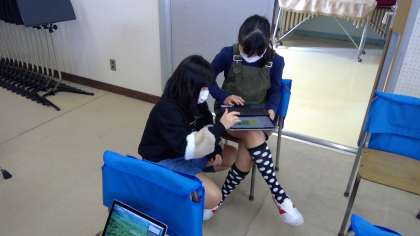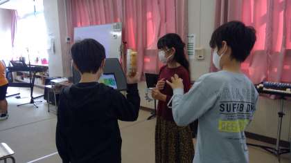 打楽器(鈴・小太鼓・ウッドブロック・ボンゴなど)の特徴を考え、音の響き方の違いや音の高低についての気づきがありました。実際の音を聴いて、特徴を理解することができました。PowerPointのリズム楽譜を、クラスの音楽チャネルに配信し、グループの友だちとリズム楽譜を見て、互いに話し合いながらリズムを創り上げました。協力しながら打楽器の特徴を生かしながら演奏できたことが素晴らしかったです。