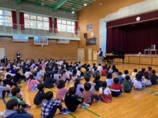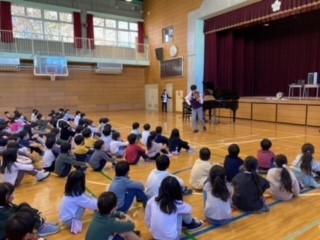 先日エバリーさんによる、ミニコンサートが行われました。1年生から3年生までみんなが知っている曲を演奏してくださいました。参加型のコンサートにどの子も楽しめ「アンコール。」の声が上がりました。心温まる時間となりました。