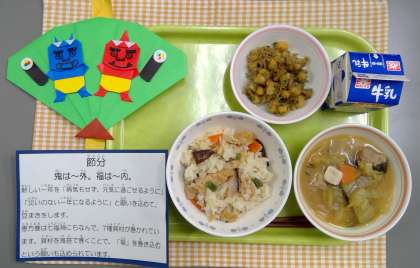きつねご飯 大豆とじゃこの飴がらめ いわしのつみれ汁 今日は節分です。 今年(2022年)の恵方は『北北西』です。