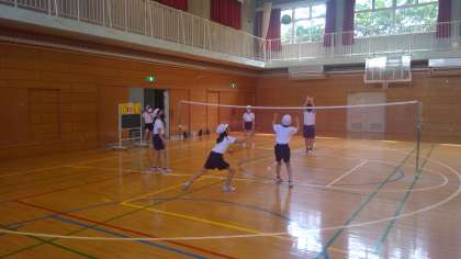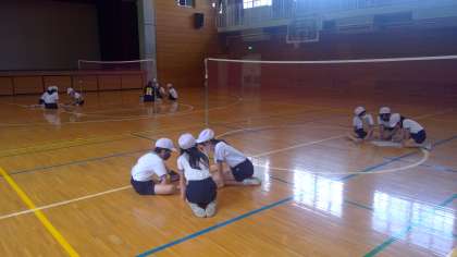 めあては「作戦をたてて実行しよう」です。次のゲームに向けて、チームごとに集まり真剣に作戦をたてています。「三角作戦」「へび作戦」「いないいないばあ作戦」など全チームが作戦をたて頑張って実行していました。ラリーが続くようになり、なかなか試合が終わりません。嬉しい悲鳴です。