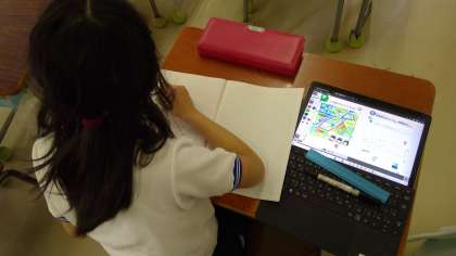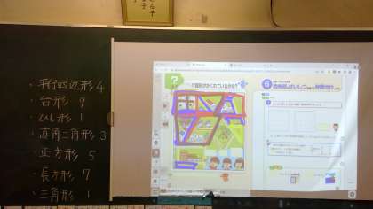 パっとみてわかる図形はすぐに見つかりました。「あれ?2つを合わせたらもう1つ平行四辺形ができた」「それならここも合わせて台形だ」次々とかくれ図形を見つけ出し、全部で30個もありました!一人では決して達成できないことも、仲間と力を合わせたら達成できる、集団による学びの深まりでした。