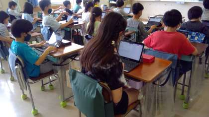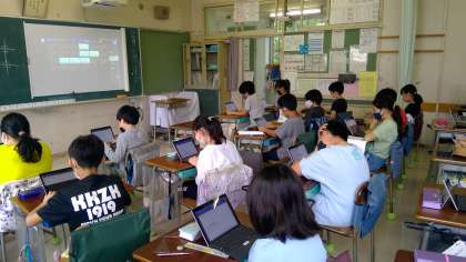 今日の問題は「次の図で、直線㋐と直線㋑は平行です。2本の直線の間に垂直な直線を何本かかいて、その長さをくらべましょう」でした。「その長さをくらべましょう」が、どこを指すのか難しかったようです。算数では問題を正しく理解するのも難しい時があります。ここでも「伝え合う力」を育成するために、前で発表して問題の意味を友達に伝えました。最後は「長方形や正方形の向かい合った辺が平行であることを説明しましょう」という練習問題をオクリンクで作成し、共有しています。