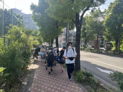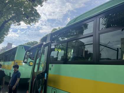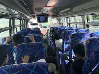 元気よく出発!バスの中ではドラえもんの映画を見ています。