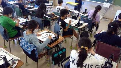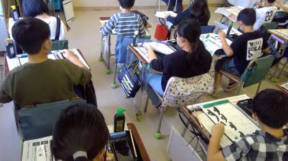 ひらがなに挑戦です。横画や縦画の多い漢字と違い、「結び」が多いひらながは穂先の動かし方が難しいので、いつもよりゆっくり慎重に筆を動かしている子が多いです。シーンと静まり返った環境も、書写には大切です。静かに集中して取り組んでいます。