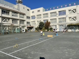先週からミニハードルを学習しています。三年生のめあては かぎかっこリズムよく跳ぶこと です。どのぐらいの間隔でハードルをおくと跳びやすいか、チームで考えながらハードルの位置をきめました。
