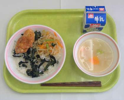 参鶏湯は丸鶏の中に食材を詰めて煮込む料理ですが、給食では朝早くから手羽先・鶏ガラ・しょうが・にんにく・ねぎをじっくり煮込んでだしをとりました。愛情とコラーゲンたっぷりな参鶏湯です!