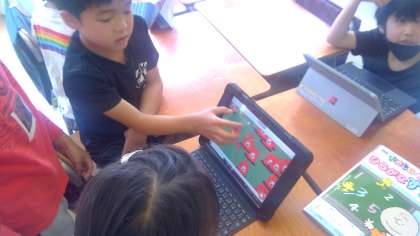 1年生にタブレットが大人気でした。2年生は知っていることを操作を一緒にしながら懸命に教えていました。