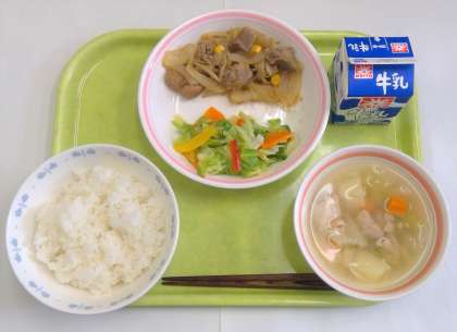 ・ご飯 ・サイコロステーキ ・カラフルサラダ ・ペイザンヌスープ ・牛乳