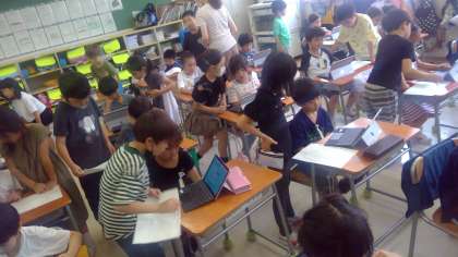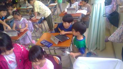 今日は、1年生にタブレットの使い方やいろいろなアプリの使い方を2年生が教えに行きました。