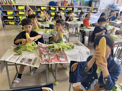 1年生がむいたとうもろこしは、給食のメニューで出ました。