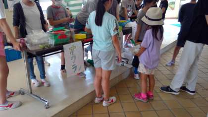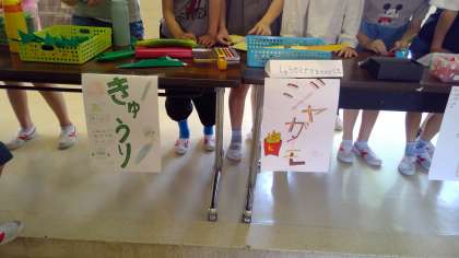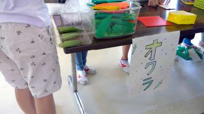 いよいよ販売当日です。あまり収穫できなかったことに「野菜作るのってむずかしい」そんなつぶやきが聞こえてきました。1年生もきてくれるかわからずドキドキしていると…暑い中買いにきてくれました!みんなで「お・も・て・な・し」をしました。オクラのお買い上げ、誠にありがとうございました!そして何より5年生が楽しそうでした。教室に戻って振り返りをしました。「緊張した」「来てくれて嬉しかった」などの感想が聞こえてきました。そして、スーパーマーケットにあんなにもたくさんの野菜が売っていることに、改めて驚いていました。売上金は本当にわずかでしたが、だからこそお金を稼ぐことの難しさ、生活できるほどお金を稼いでいる親への感謝など、世の中のしくみに触れた1日でした。