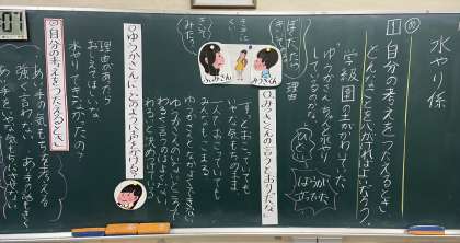 「水やり係」の話を読み、自分の考えを伝える時に、どのように伝えるといいか、登場人物の役割を演じながら伝え方を考えました。相手の気持ちを考えること、一方的な強い言い方ではなくやさしく言うこと、傷つけない言い方で伝えるとよいことなどを考えることができました。生活の中で友達に言いたいことを伝える時に、学んだことを思い出して伝えられるといいなと感じます。