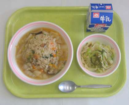 スープは調理員さんが朝早くから鶏ガラ・豚ガラ・香味野菜を一緒に煮込んでだしをとっているので、いつも美味しく仕上がっています♪