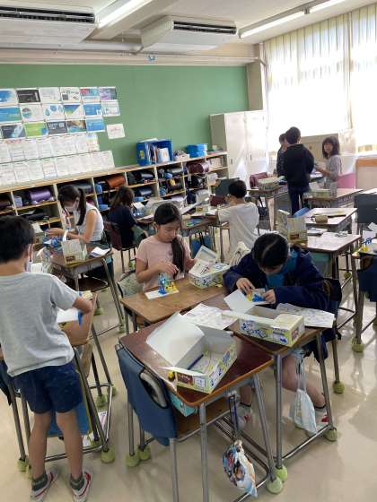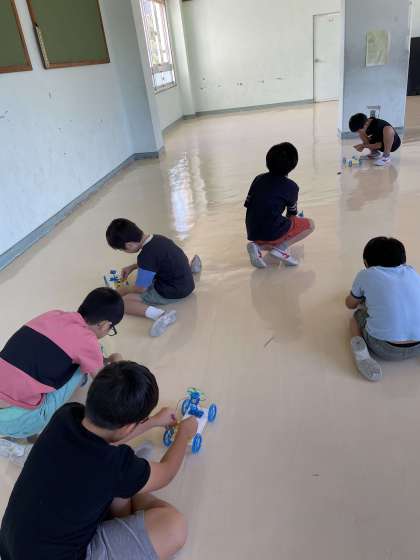 理科では、電気のはたらきについて学習しています。今日は、直列つなぎと並列つなぎを学び、それを生かしてモーターカーを作りました。速く走らせるにはどのように回路を作れば良いかをよく考え、教え合いながら楽しく取り組むことができました。