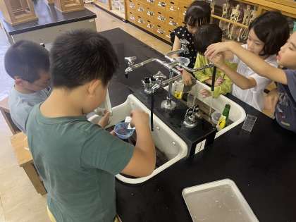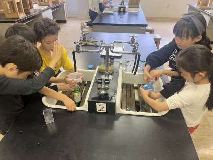 今日の算数は、理科室で水のかさの学習をしました。ビンや牛乳パック、やかん等を用意し、水のかさの比べ方について考え、グループで調べました。