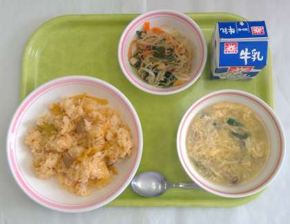 キムたくご飯とは…「キムチ」と「たくあん」が入った混ぜご飯です。今回は豚肉も入っています。漬物文化が長野県で発達していて、子ども達に漬物をおいしく食べてもらいたいという想いからキムたくご飯ができたそうです。キムチの酸味とたくあんの甘味、ポリポリとした食感は子ども達に大人気でした。