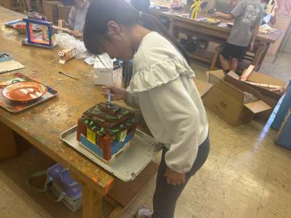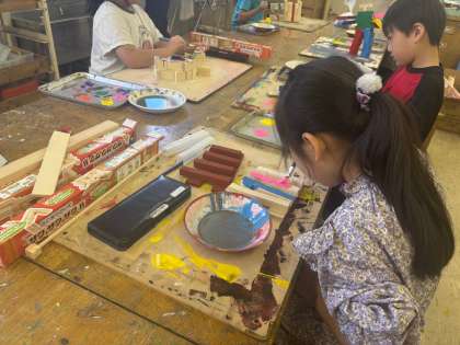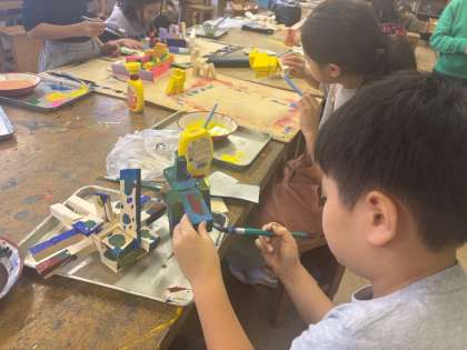 EXPOに向けて、立体作品づくりを進めています。のこぎりで切った木の部品を組み立てて、色をつけています。完成が楽しみです。