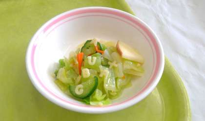 ABCsaladにはアルファベットのマカロニを入れて英語を楽しめるようにしています。そこにりんごも入れて野菜が苦手な子も食べられるように工夫しています。