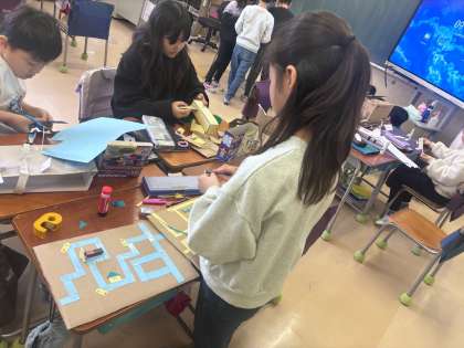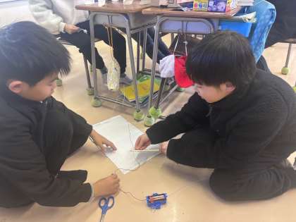 理科で学習してきたことをもとに、目的をもっておもちゃづくりに取り組んでいます。ゴムや電気、磁石の性質を利用して試行錯誤しながらつくっている様子が見られます。自然と友達とアドバイスし合えるようになっていることにも成長を感じています!
