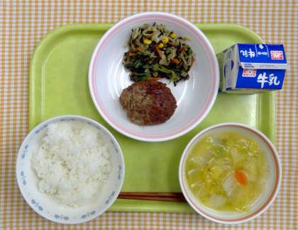 ご飯 ハンバーグ ひじきサラダ 白菜スープ