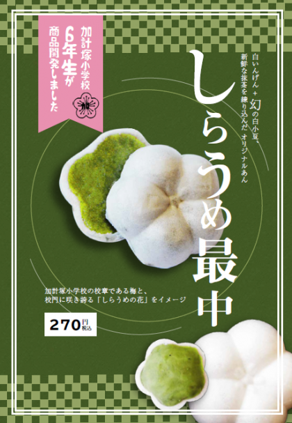 昨年度、職業体験でお世話になった豆園さんで、こども達の考えた商品「しらうめ最中」の販売が決定いたしました。