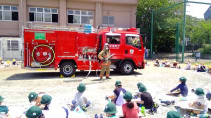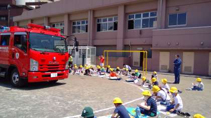 子どもたちは、消防車と防火服に身を包んだ消防士さんを見て「かっこいい。」と声を上げていました。