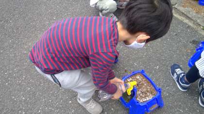 土に指で穴をあけて種を植えました。子供たちは丁寧に水をやりながら、「はやく育たないかな。」と嬉しそうに話していました。