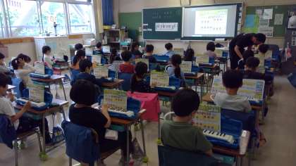 音楽の時間に、けんばんハーモニカの授業をしました。夢中で演奏し、意欲的に活動していました。