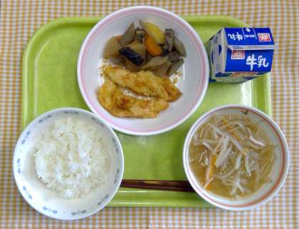 ご飯 鶏天の胡麻だれがけ 根菜の煮物 もやしの味噌汁