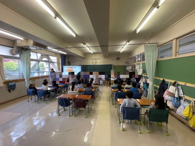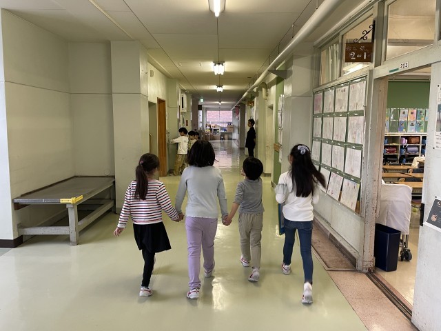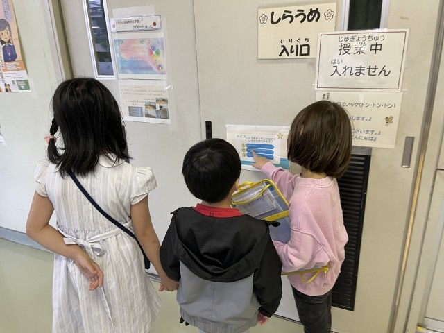 今日は、1年1組と聞いて2年1組のがっこうたんけんです。クイズや説明を通して学校のことをさまざま教えてもらいました。「こんな2年生になりたいな」教室に帰ってからの振り返りでは、憧れを口にしていました。