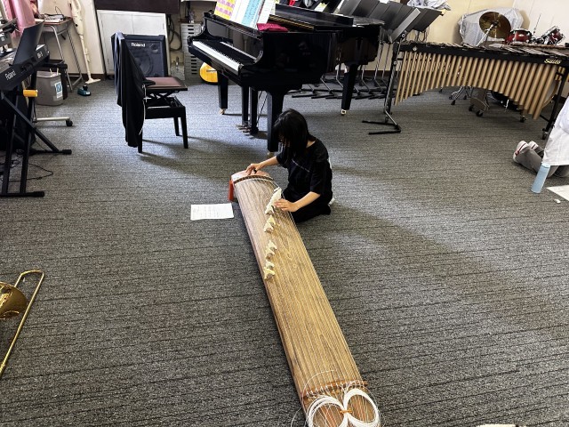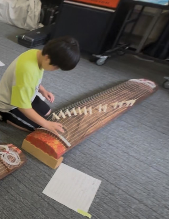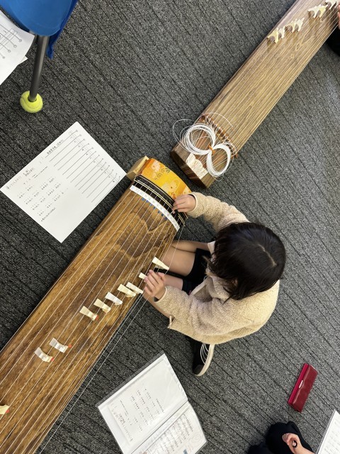 「さくら さくら」の旋律を琴で弾きました。初めてとは思えないほど、みんなとても上手でした。グループで教え合う姿も見られました。「さくら さくらが弾けるようになった!」「もっとやりたい!」「家でもやりたいから琴が欲しいな。」など、楽しんで取り組むことができました。