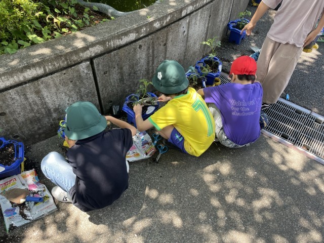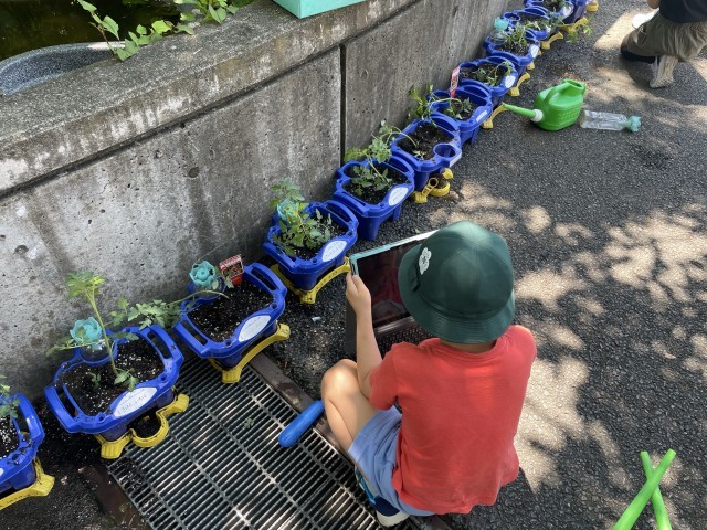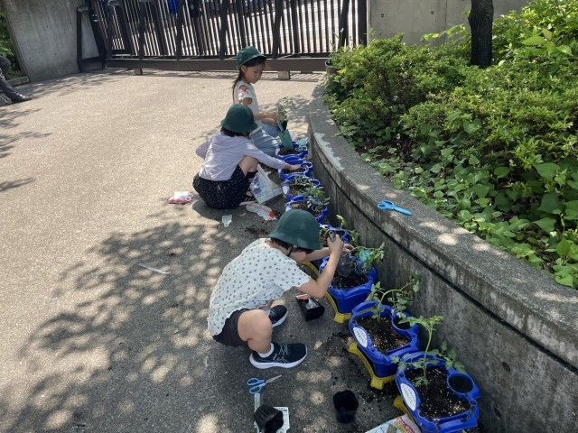 生活科でミニトマトの苗を植えました。1年生の時、アサガオを植えていた鉢に植えました。苗をポットから出すときは「壊れそう」とドキドキしながらひっくり返しました。しっかりと苗を植えた後は観察です。タブレットで写真を撮った後、大きさやにおい等、詳しく書くことができました。これから大きくなるのが楽しみです。